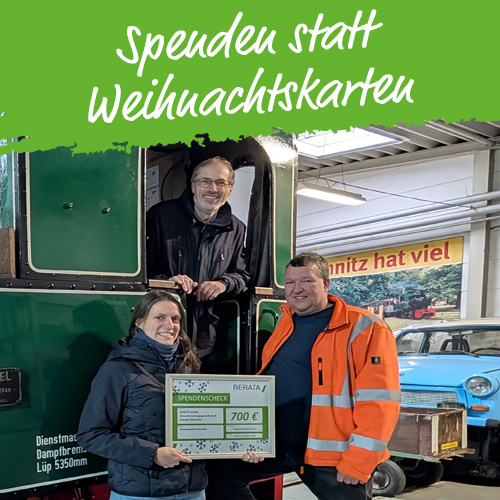 Die BERATA-GmbH Chemnitz spendet in diesem Jahr 700 Euro an die Parkeisenbahn Chemnitz gGmbH. Mit unserer Aktion „Spenden statt Weihnachtskarten“ fördern wir bewusst ein regionales Kinder- und Jugendprojekt, das seit 1953 überwiegend von jungen Parkeisenbahnern ab 10 Jahren betrieben wird.